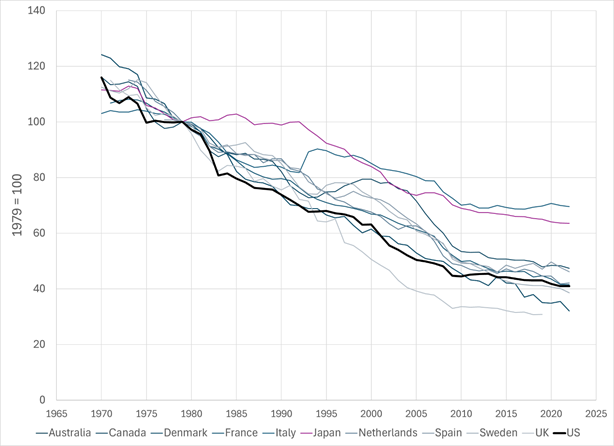 <span id="point-4-body" scroll-to="point-4-head">[4]</span> The highest, 53 percent, is for the United Kingdom, where there is a break in the data between 1996 and 1997. Correcting that break might lower the decline so that it is perhaps 47-48 percent— closer to the next-highest drop, 45 percent in Australia. The lowest, 19 percent is for Italy, but there is a break in the data between 1992 and 1993. If corrected, the decline would be 26-27 percent. There is also a break in the US data between 1982 and 1983. The estimates in Figure 1 indicate a decline of 38 percent.