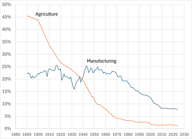 Figure 1. Manufacturing and Agricultural Share of Employment in the United States, 1890-2024