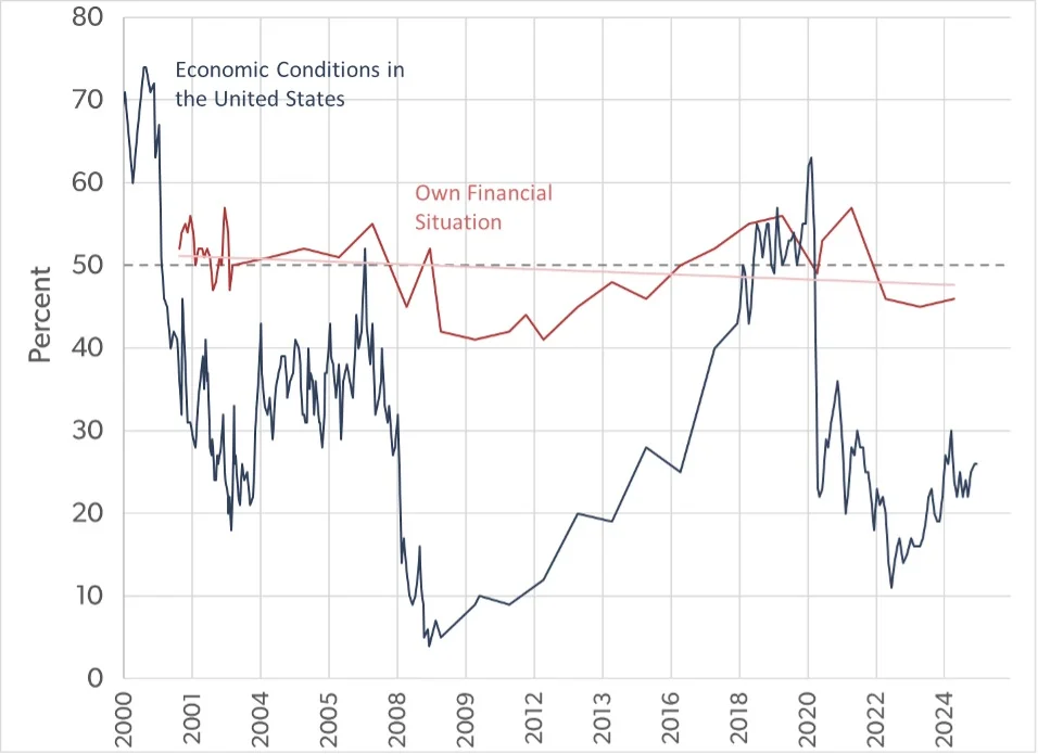 More relevant for assessing how we should feel about the 46 percent figure is the context provided by a trend. Gallup asked Americans about their personal financial situation 44 times from August 2001 to April 2024. The blue line in Figure 4 repeats the trend from Figure 2 in the share of Americans rating national economic conditions as good or excellent. The dashed line at 50 percent confirms that this has mostly been a minority position over the years. However, around half the population has rated their financial situation good or excellent, as shown by the dark red line. The share was below 50 percent during the Great Recession and above during the subsequent boom years. The light red line indicates the linear trend over these 24 years, which nearly sits on the 50 percent line.