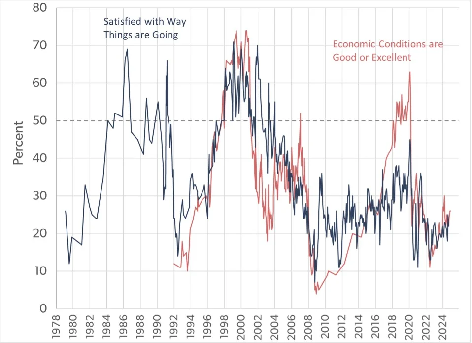 Source: Tabulation of Gallup data from https://news.gallup.com/poll/1669/General-Mood-Country.aspx and https://news.gallup.com/poll/1609/consumer-views-economy.aspx.