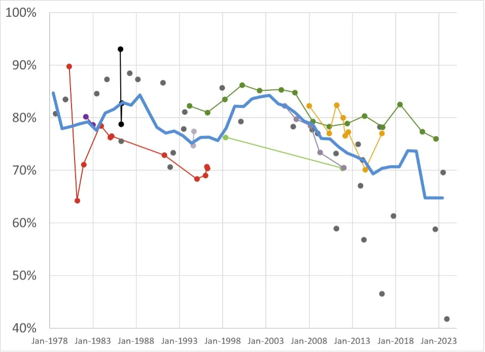 Figure 1 presents the results. (Ignore the thick blue line for now.) I connect the data points in cases where the same organization asked the same question in the same way multiple times; the rest are shown as points that may or may not be comparable to each other.