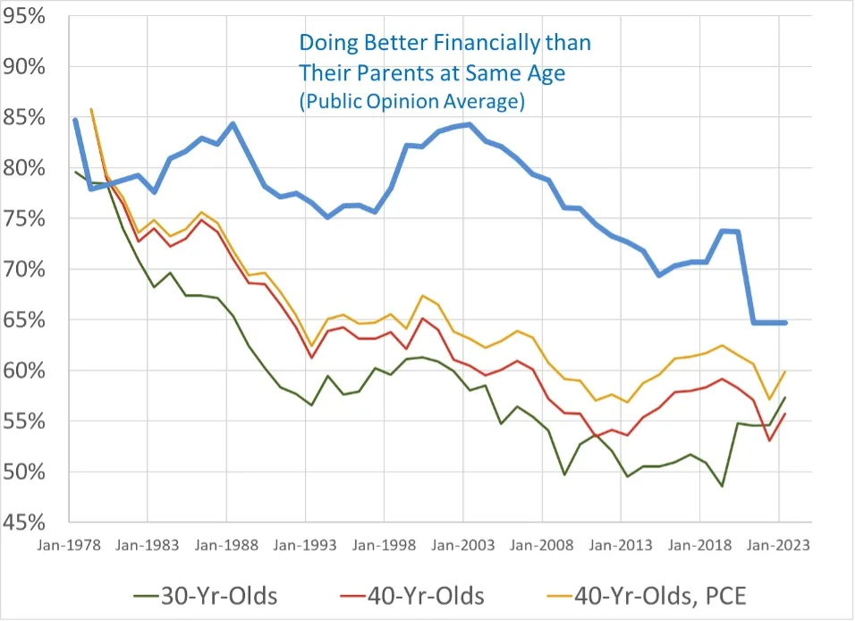 Figure 2. Percent of Adults Saying They Are Better Off than Their Parents vs. Estimates of Actual Absolute Mobility, 1978-2023