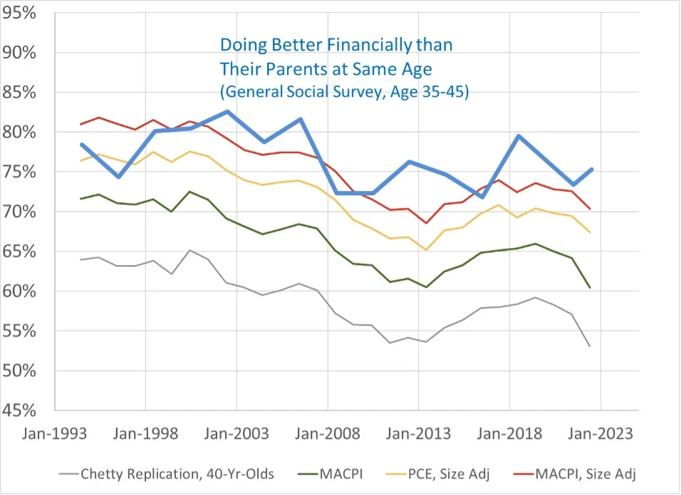 The yellow line uses a different methodology to adjust 40-year-old incomes for the rising cost of living over time. (Technically, it uses the “personal consumption expenditures price index,” or PCEPI, preferred by the Federal Reserve Board and the Congressional Budget Office—and by me—over the “consumer price index research series” used by OI.) This switch increases absolute mobility to 60 percent in 2023 and slightly reduces the decline over time. But the rates still don’t align well with the public opinion trend.