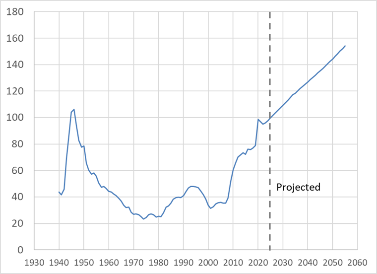 Figure 1. Federal Debt Held by the Public as a Share of Gross Domestic Product, 1940-2054