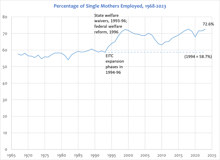 The reason is that employment among single mothers dramatically rose in the 1990s and stayed elevated relative to pre-reform levels: